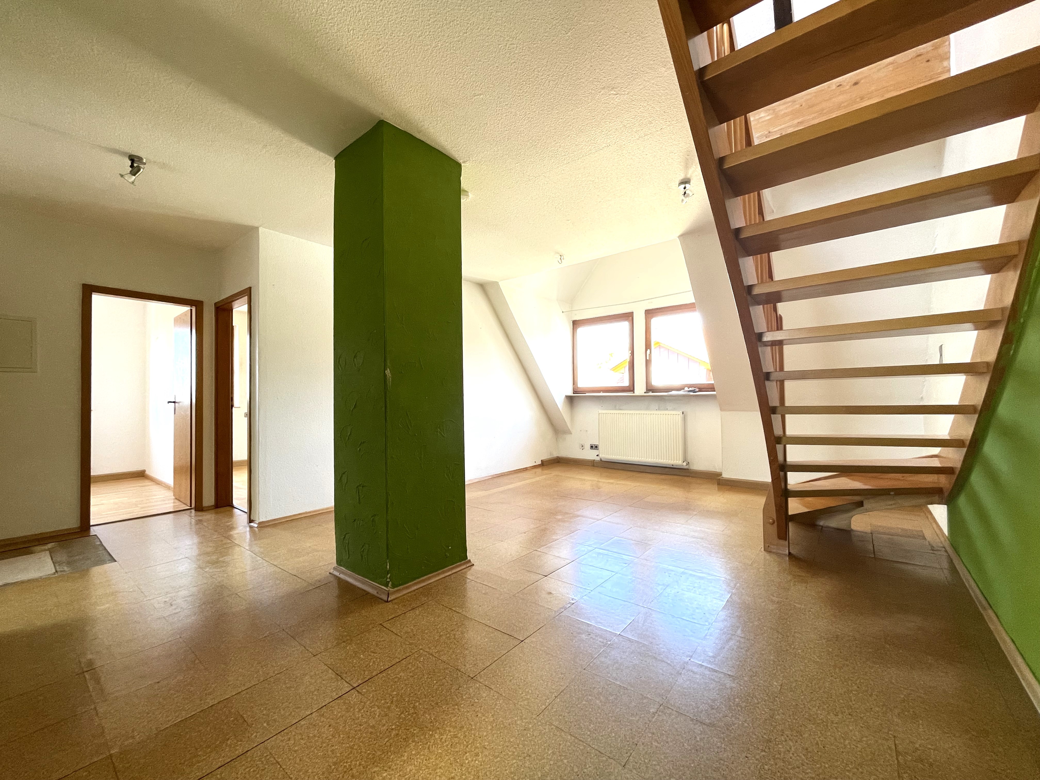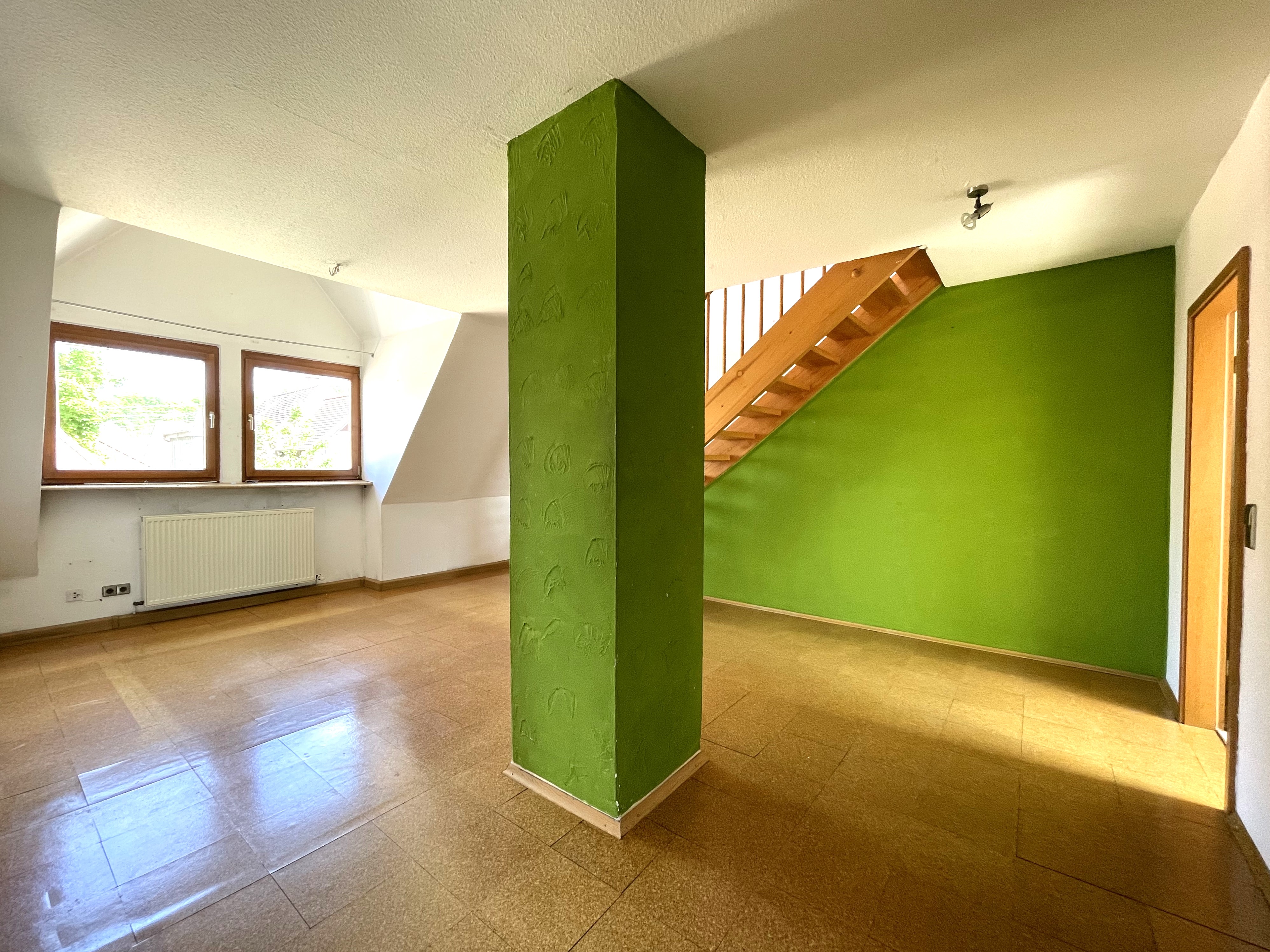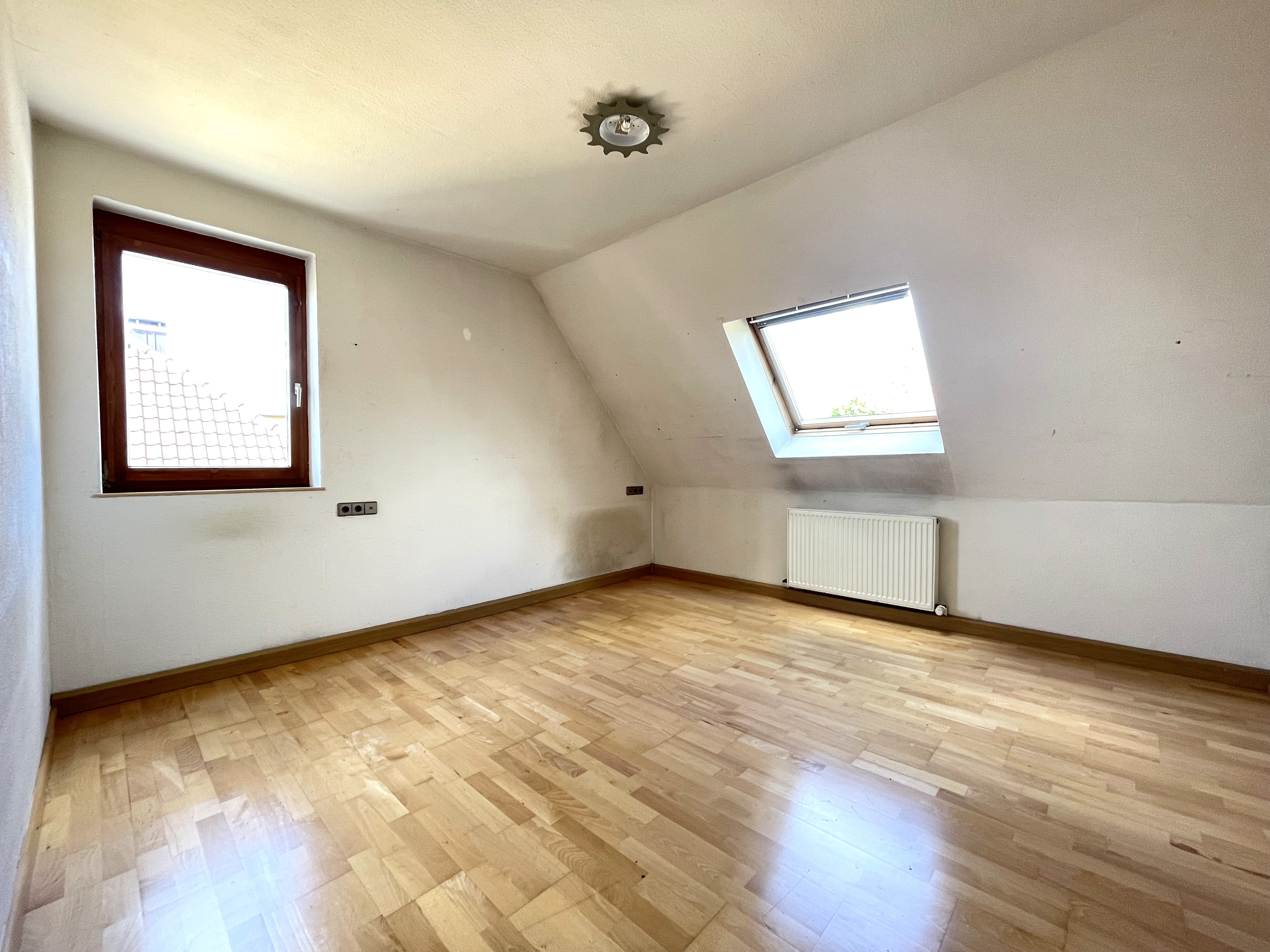 Über eine Holztreppe gelangt man in den Dachspitz. Hier befindet sich ein weiteres Zimmer, das vielseitig genutzt werden kann. Zusätzlich stehen zwei praktische Abstellräume zur Verfügung, die wertvollen Stauraum bieten. Ein Kellerraum gehört ebenfalls zur Wohnung und bietet zusätzlichen Platz.