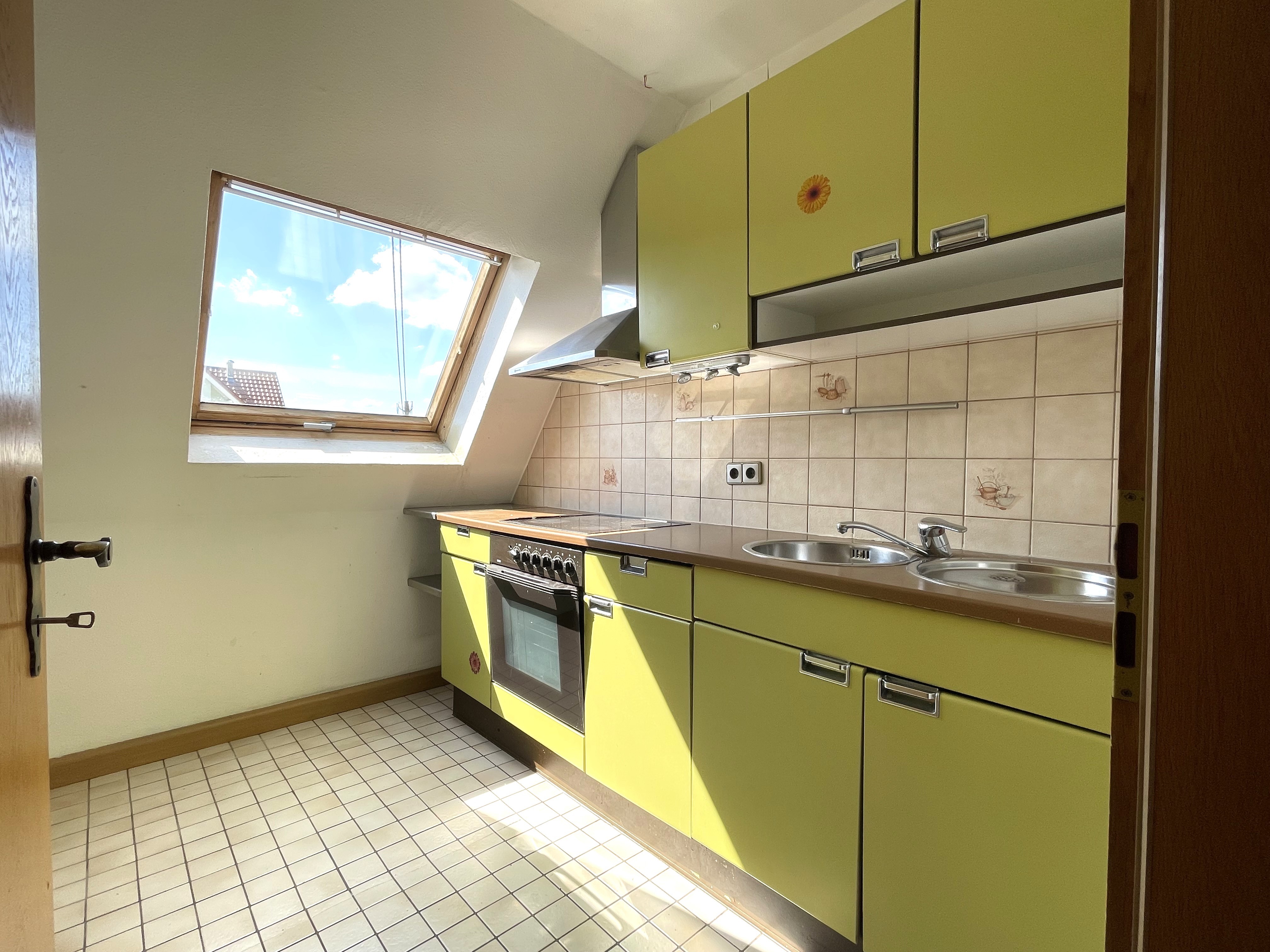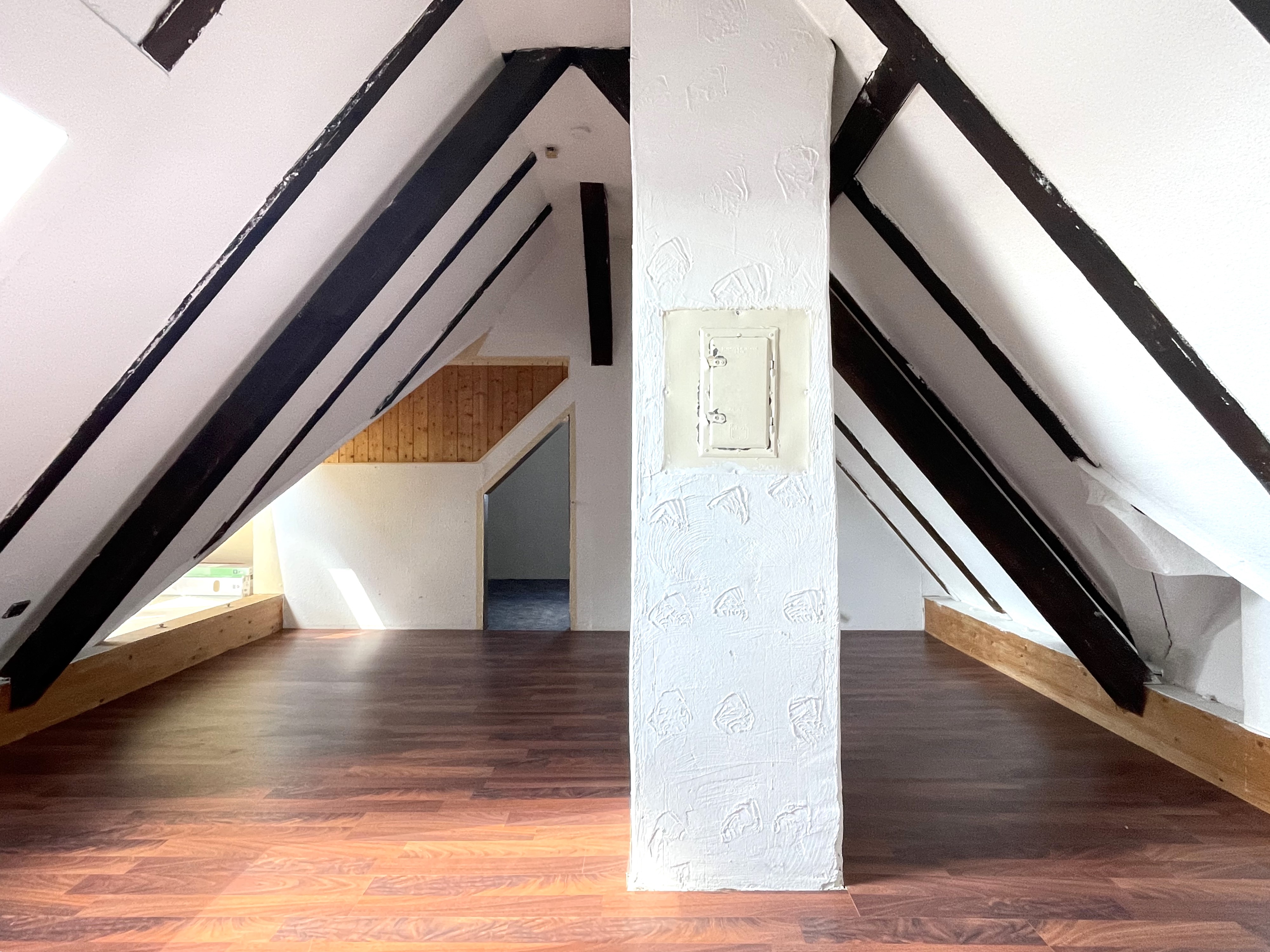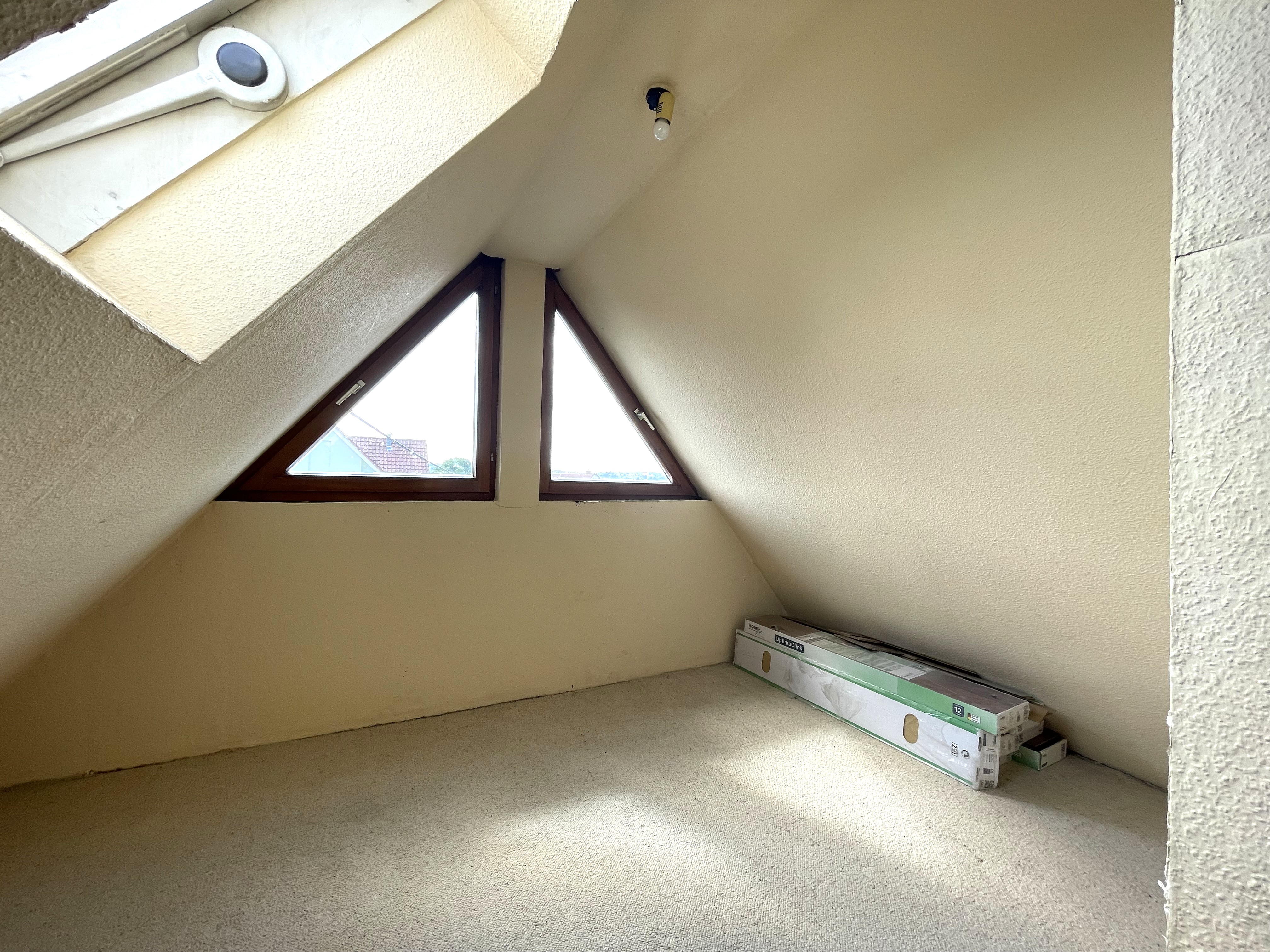 Über eine Holztreppe gelangt man in den Dachspitz. Hier befindet sich ein weiteres Zimmer, das vielseitig genutzt werden kann. Zusätzlich stehen zwei praktische Abstellräume zur Verfügung, die wertvollen Stauraum bieten. Ein Kellerraum gehört ebenfalls zur Wohnung und bietet zusätzlichen Platz.